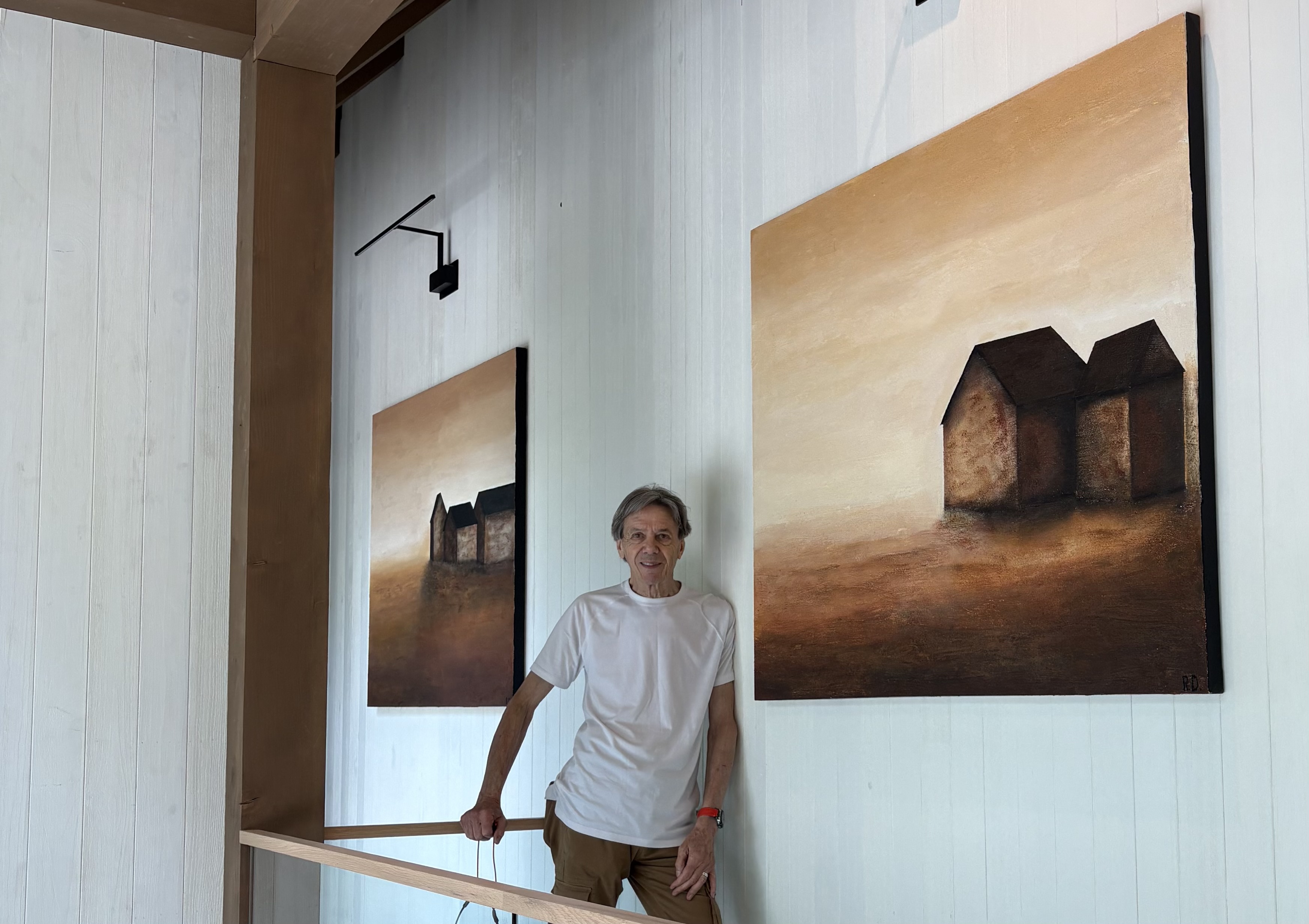 His pictorial work—a continuation of his photographic past—revolves around contrast, silence, and light. His canvases play upon shadows and forms, creating architectural atmospheres that are at once structured and contemplative. Walls, rooftops, and geometric lines become subjects through which light reveals the invisible.